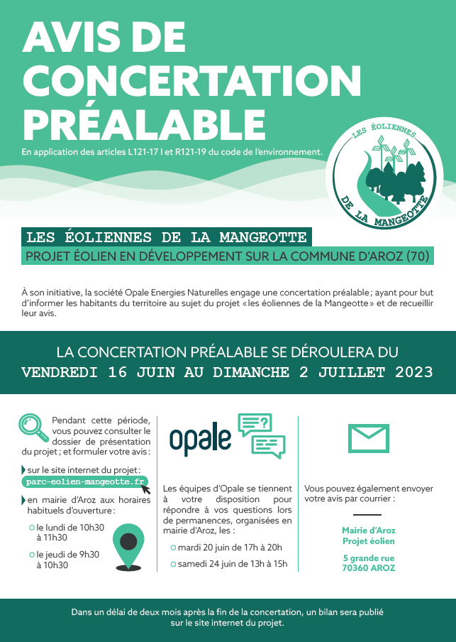 A son initiative, la société Opale Energies Naturelles a organisé une concertation préalable; ayant pour but d’informer les habitants du territoire au sujet du projet « les éoliennes de la Mangeotte », situé sur la commune d’Aroz (70) et de recueillir leur avis.