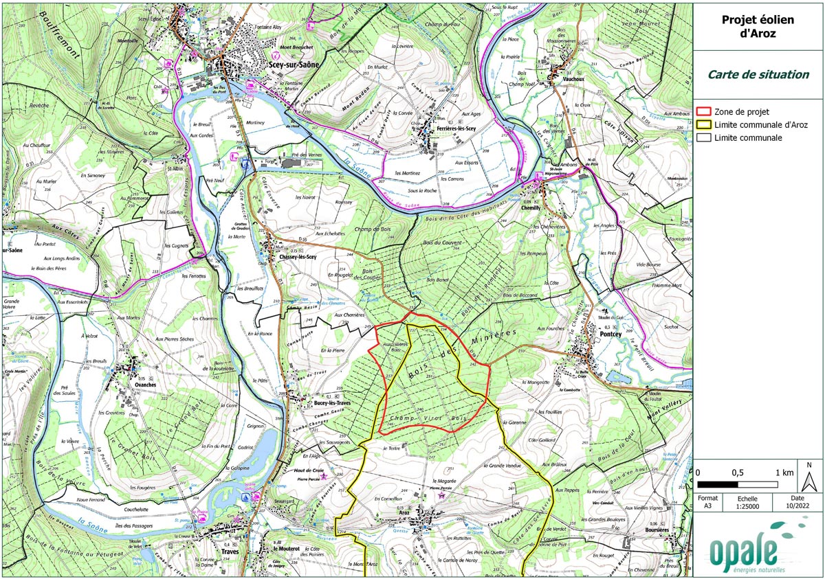 Porté par la société franc-comtoise Opale Energies Naturelles, l’ensemble des études de développement du projet éolien d’Aroz arrivent à leur terme. Ce projet dimensionné entre 3 et 4 éoliennes s’implanterait sur la forêt communale d’Aroz.